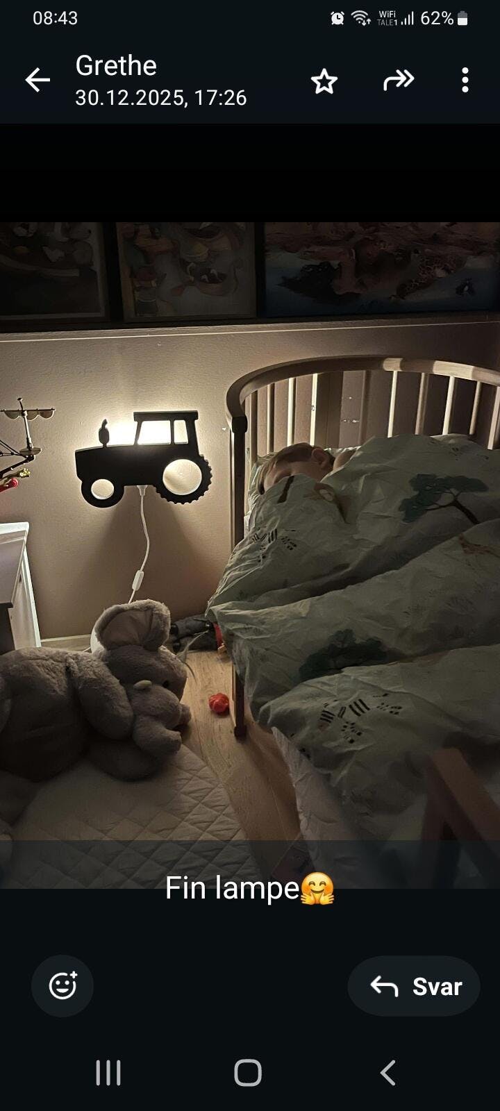 Denne kule lampen i form av en gravemaskin ser superkul ut på gutterommet! Det er en stor bobcat-lampe på hele 40 x 23 cm. Nattlampen er laget av MDF. Lampen er fin å se på om dagen, men ekstra fin i mørket når lyset er på! Den svarte fargen gjør denne gravemaskinen moderne og ekstra kul, slik at den passer godt på alle barne- og babyrom.